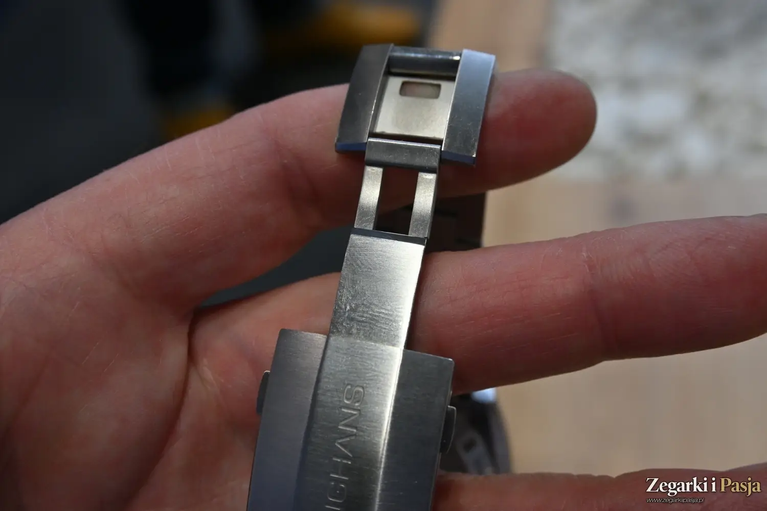 Ma ona trójpłaszczyznową powierzchnię, ma też dodatkową zapadkę chroniącą przed przypadkowym rozpięciem. To dopiero pod nią znajdują się przyciski zwalniające klamrę. Te, które widzimy od razu, służą do uruchomienia mechanizmu poszerzania bransolety.
