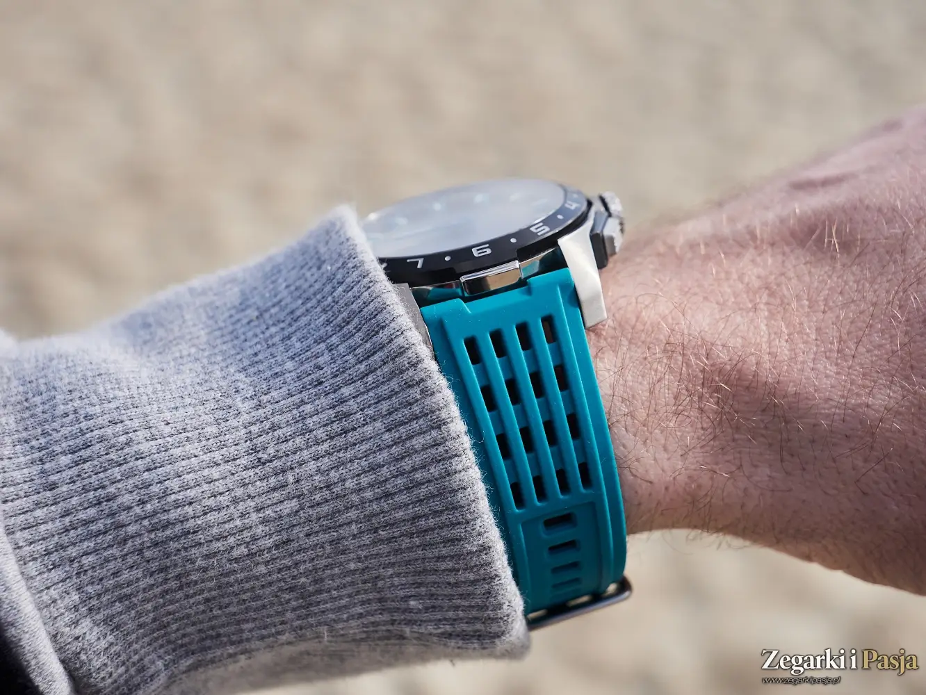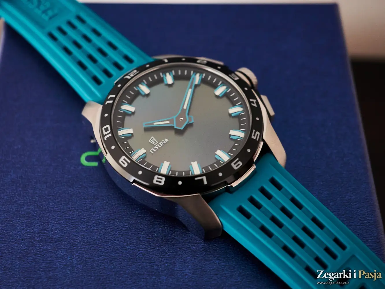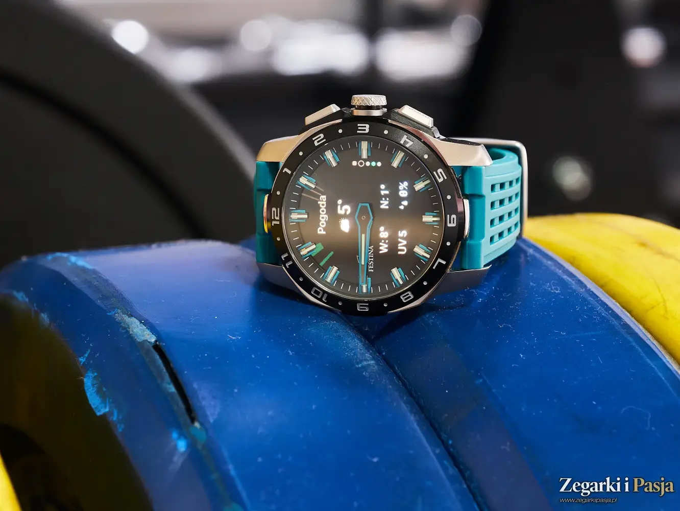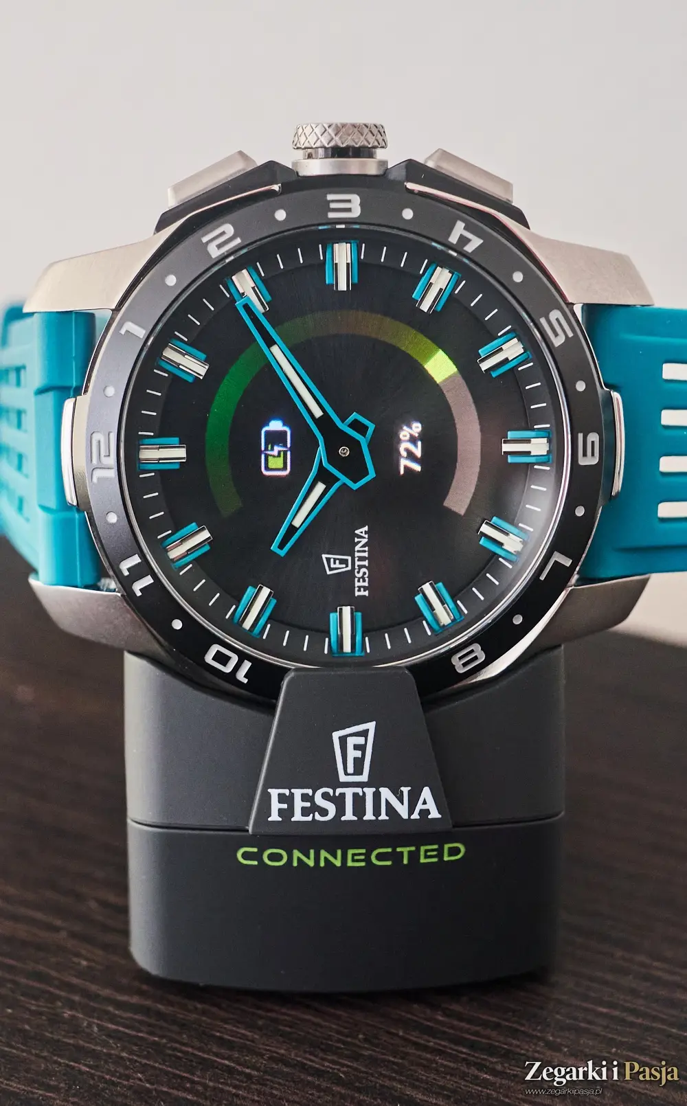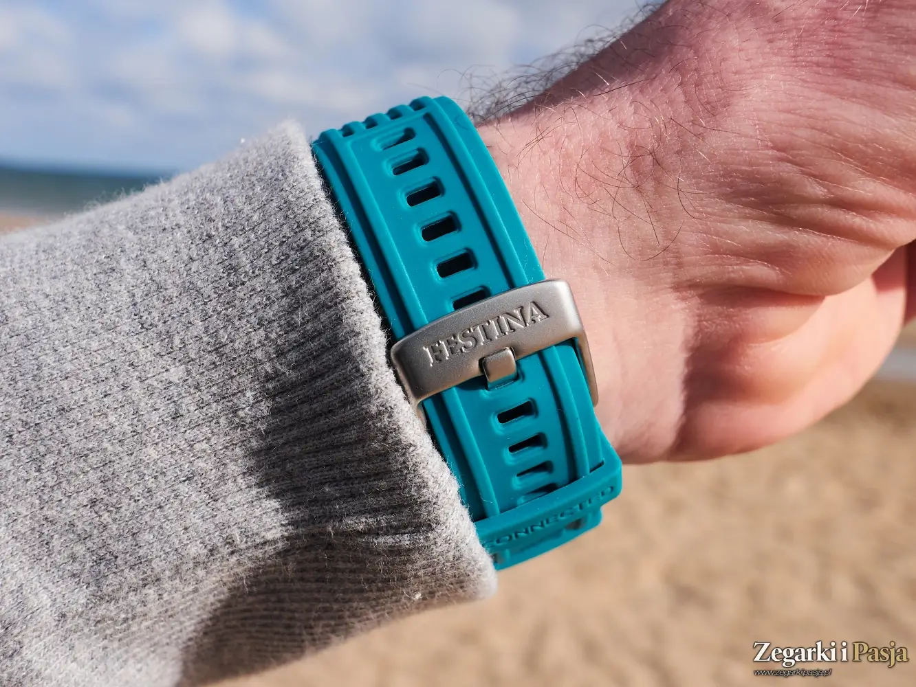 Zegarek jest wygodny w noszeniu, a mimo swoich 44 milimetrów średnicy oraz 14,6 milimetrów grubości jest lekki, i nie czuje się go na nadgarstku. Zaś silikonowy pasek jest przyjemnie miękki i elastyczny. Wersja Festiną Connected Full D, którą dostaliśmy do testów, nosząca numer referencyjny 23305/5, jest w kolorze turkusowym i przyznam, że bardzo mi się podoba.