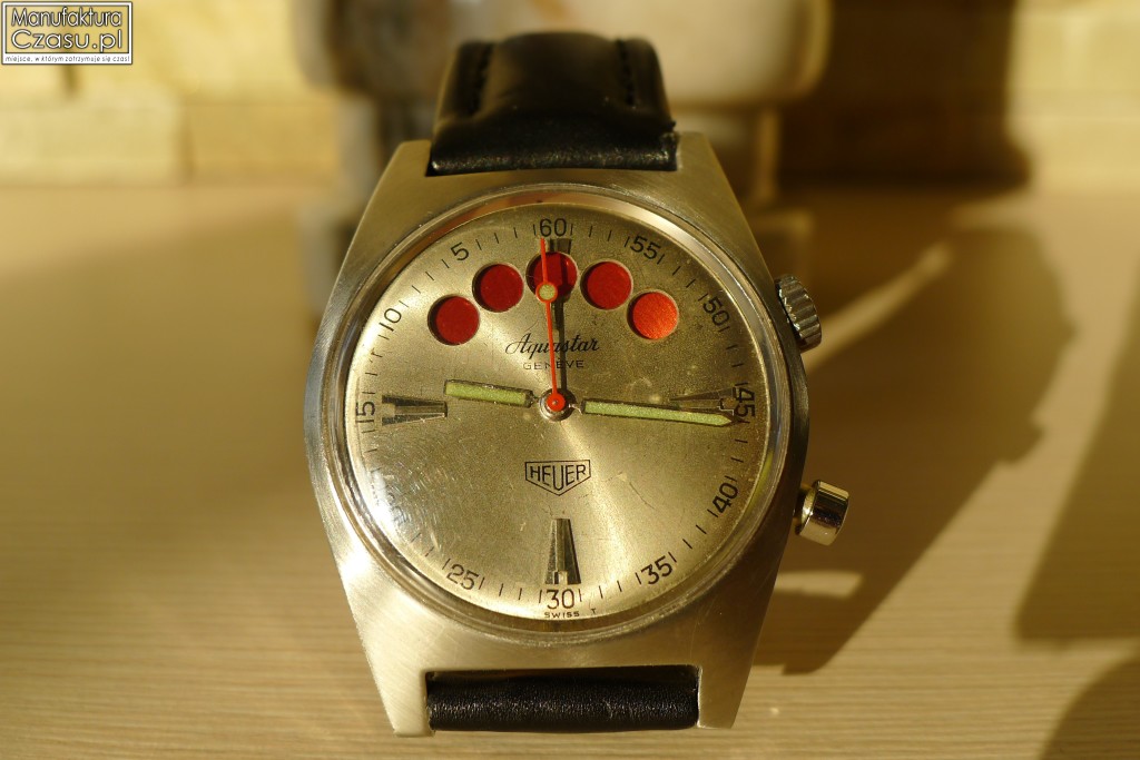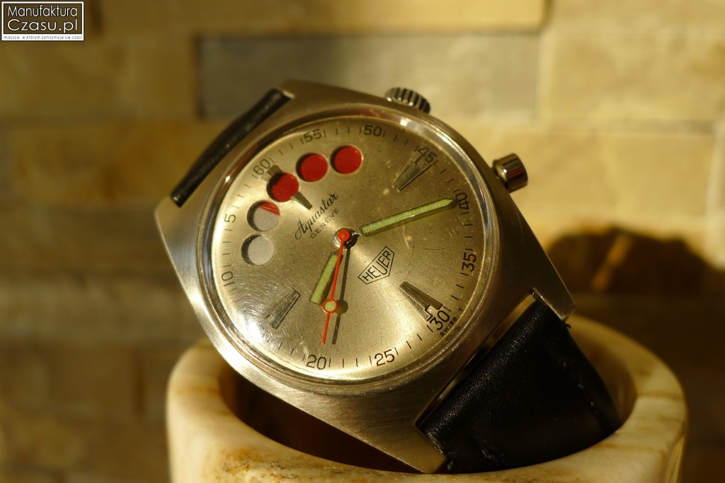 Wskazówki wypełnione są masą fluorescencyjną. W około tarczy widoczna jest wyraźna podziałka minutowa w formie malowanych indeksów. Indeksy nakładane znajdują się tylko w czterech miejscach tarczy, na godzinie 12.00, 3.00, 6.00 i 9.00. Ponadto na tarczy umieszczono logo HEUER a także nazwę producenta: Aquastar.