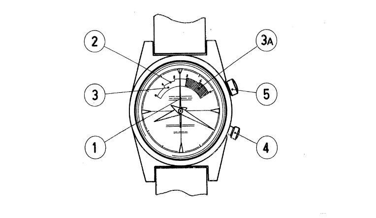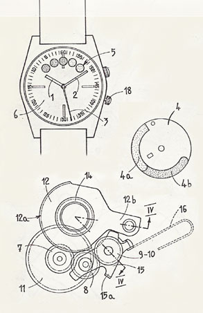 „Załączona konstrukcja prezentuje, jako przykład, rodzaj wykonania fragmentu wyrobu zegarmistrzowskiego będącego przedmiotem wynalazku. Rysunek przedstawia zegarek w formie, w jakiej otrzymuje go użytkownik. Ramię wskazówki sekundnika 1 znajduje się w centrum, a tarcza zawiera otwór 2, przez który widoczna jest górna powierzchnia narządu wskazującego 3, w tym strefa 3A w kolorze, wskazująca stopniowy upływ czasu przez otwór w tarczy, jaki minął od ponownego ustawienia na zero ramienia sekundnika, uzyskanego przez naciśnięcie przycisku 4, korona 5 wykorzystywana jest do nakręcania zegarka i ustawiania ramion wskazówki godzinowej i minutowej”.