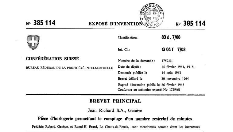 Historia linii zegarków Regate rozpoczyna się dokładnie 30 listopada 1964 roku, kiedy to na bazie poprzedniego patentu powstaje kolejne rozwiązanie techniczne – również zastrzeżone szwajcarskim patentem o numerze 385 114 – pod nazwą: