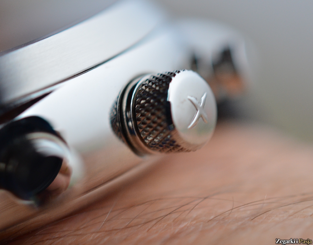 Wszystko w tradycyjnym najczęściej spotykanym układzie. Na godzinie 2-giej i 4-tej przyciski – mają one bardzo wysublimowany wzór. Dość mocno odstają – przez co są bardzo wygodne w użytkowaniu i na szczęście nie są przeszkodą w wygodnym użytkowaniu zegarka. Zaskakuje ich świetna obróbka i nacięcia w postaci rowków dookoła – co na myśl przywodzi tłoki silnika. Standardowo górny przycisk służy do uruchamiania i zatrzymywania stopera, a dolny do resetowania wskazań tej komplikacji.
